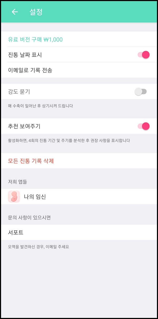 진통 측정과 진통 멈춤 기능만 있었습니다. 병원을 가야 한다는 문구를 보고 싶어서 계속 진통 시작 버튼과 멈춤 버튼을 눌러보았는데 아쉽게도 반응은 없었습니다. 실제로 진통을 느껴서 하는 게 아니라 임시로 진통 버튼을 눌렀다 껐다 한 거라서 병원 가기 추천 내용이 안 나온 것 같습니다. 직접 확인할 수는 없었지만 다른 사용자분들의 후기에 따르면 기능은 잘 작동하는 것 같습니다.